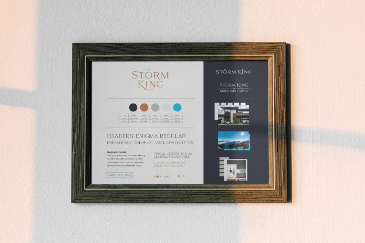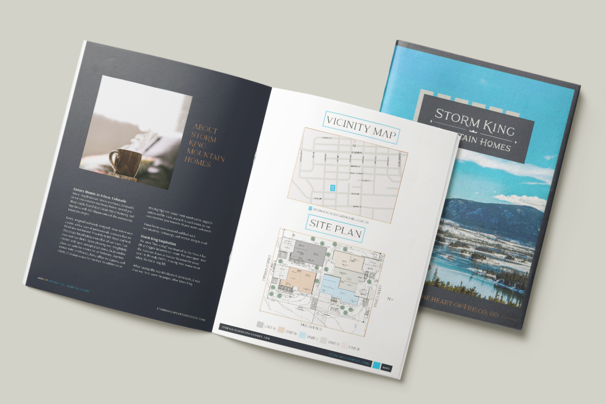 Problem: Storm King mountain homes needed a brand identity that would accurately represent the luxury townhome development in Frisco, Colorado. The challenge was to create a brand that evokes the unique, high-end modern mountain design of the units. Solution: To meet this challenge, I designed a brand identity that captured the essence of the development's modern mountain aesthetic. The brand included a logo and color scheme that were used across all marketing materials, including sales pieces. This helped to create a professional brand that would attract potential buyers even before groundbreaking.